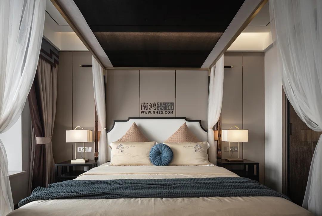 主臥背景墻選用淺色的硬包內嵌金屬條,軟裝上則應業主的需求,布置得相當古色古香,唯美的東方韻味,置身其中,讓人只想隔絕一切喧囂,回歸最真實的恬淡心境。