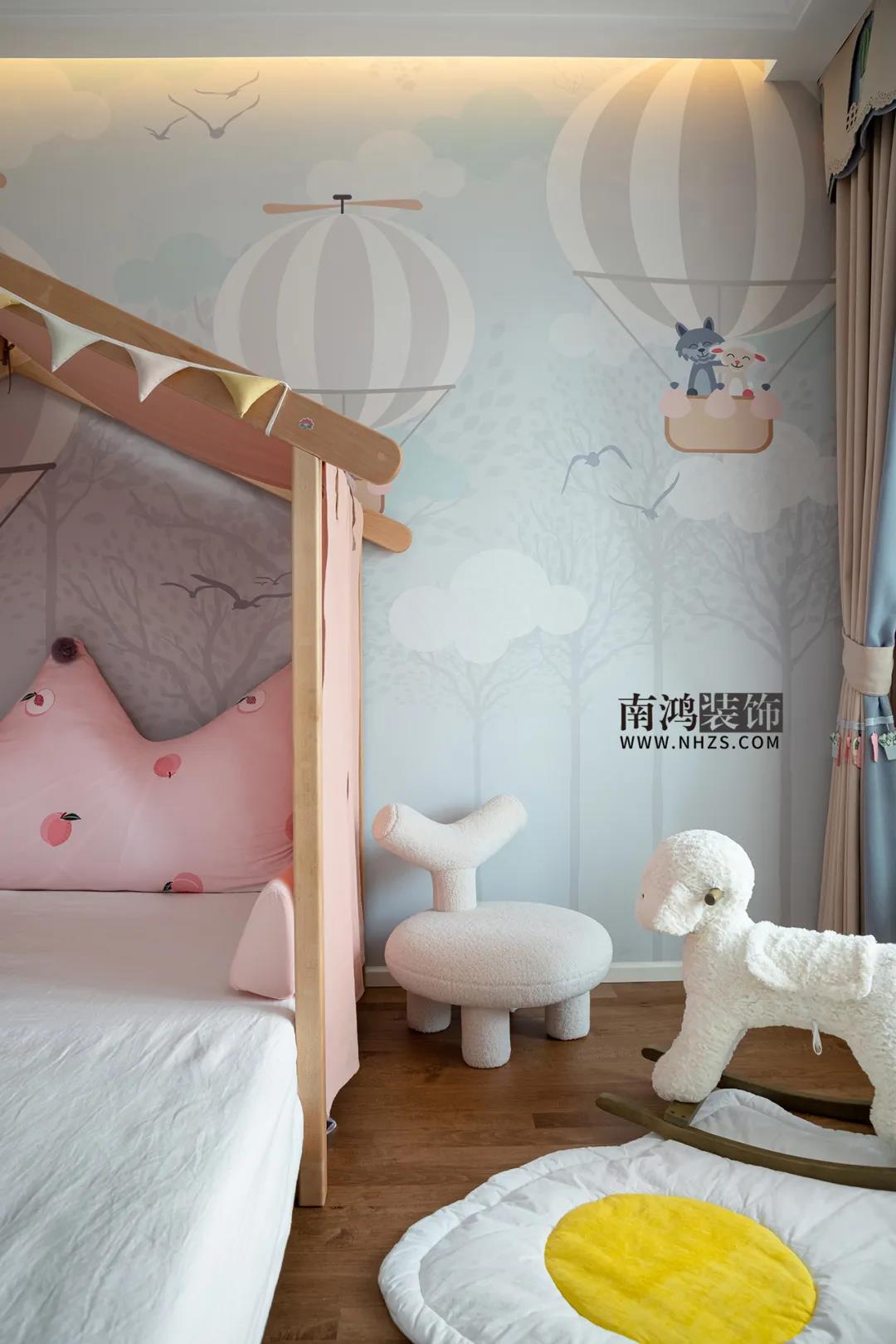 兒童房一。給小公主布置的房間,無論是粉色樹屋小床,還是鉛筆狀的掛衣桿,亦或是窗簾、背景墻、床頭柜、地毯,都是童趣滿滿的選擇,想必一定能成為孩子最愛的休憩場所。
