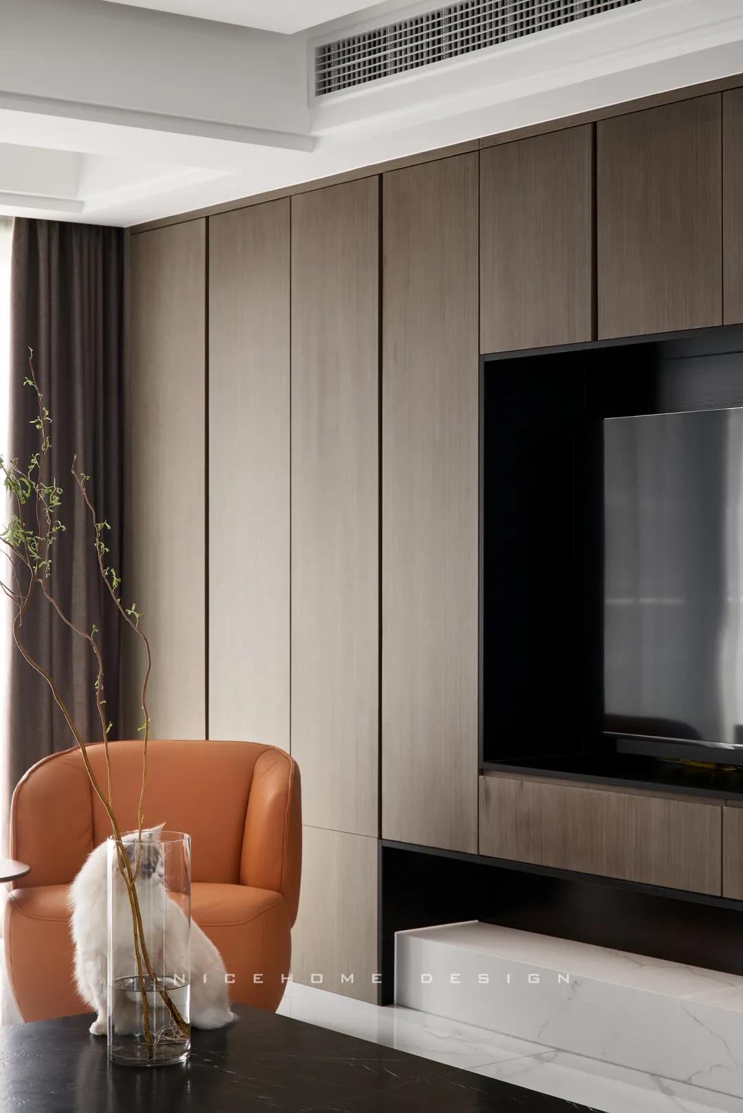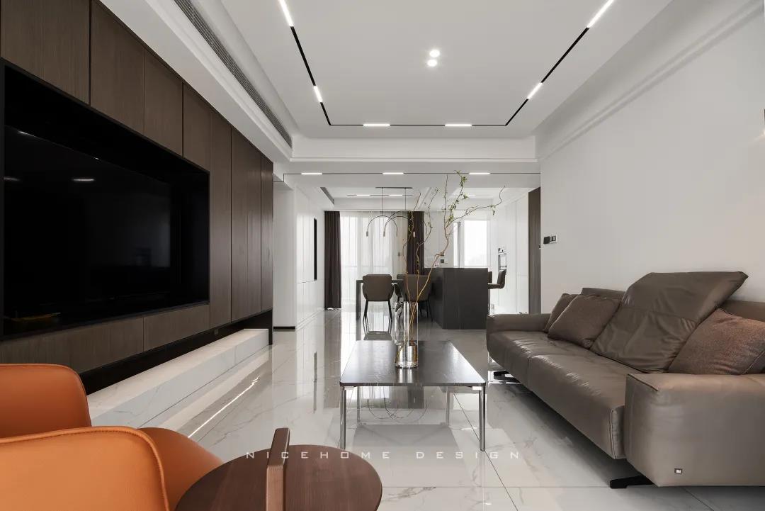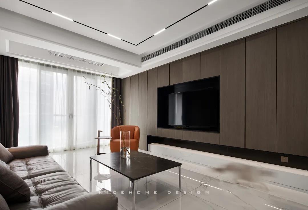 Quiet Time 本案以現(xiàn)代簡約風(fēng)格為主旨,潔凈的配色、高級感的家具材質(zhì),以及巧妙的空間序列規(guī)劃,再加上通透寬敞的開放式布局,令整體空間在理性的架構(gòu)中傳達(dá)著現(xiàn)代主義的美學(xué)觀感。 ? 案例信息 地址:天鴻君邑 戶型:兩室兩廳 面積:145㎡ 風(fēng)格:現(xiàn)代簡約 設(shè)計(jì)施工:浙江南鴻裝飾 ? 戶型分析 屋子是超高層建筑,一方面承重結(jié)構(gòu)比較多,能動(dòng)的墻體有限,另一方面采光通風(fēng)非常好。 主要是把原來的入戶花園改為了廚房,這樣原來的廚房就可以作為西廚和餐廳的一部分,解決了功能上的需求也讓餐廚區(qū)更寬敞。 走廊型玄關(guān),與內(nèi)里的過道無縫銜接,加上燈線的拉伸,視覺延展性極強(qiáng)。左手墻面留白,右手邊做深木色的收納柜提供合適的收納空間。 空間遵循現(xiàn)代簡約的架構(gòu)模式,主色調(diào)由明凈的白和溫潤的木組成,淡然含蓄,幾根萌發(fā)綠意的小枝椏點(diǎn)綴出自然空靈的氣息。 電視背景墻做整面的柜體,地臺取代電視柜的位置,與上方柜體拉開一定距離,削減了一定厚重感。茶幾臺面選擇巖板材質(zhì),四四方方的造型含規(guī)整有序之意。 局部放置一把橙色單椅,讓視覺更富有生機(jī),搭配置物小邊幾,閑暇時(shí)光的閱讀、喝茶也有了好去處。 屋子采光極好,開放式格局進(jìn)一步放大優(yōu)點(diǎn),光線灑入空間,成為天然的柔光濾鏡。明朗有序的線條,搭建起主人向往的現(xiàn)代品質(zhì)生活。 餐廚空間進(jìn)行重新規(guī)劃后,餐廳與西廚合為一體,兩側(cè)白色高柜充分利用空間,把收納效率提到極致,極簡銑槽柜門無把手,讓視覺保持統(tǒng)一干凈。 一體成型的黑色巖板餐桌結(jié)合西廚島臺,塑造空間純粹內(nèi)斂的高級質(zhì)感,清冷有型之中悄然散發(fā)出精致韻味。 步入主臥,過道一側(cè)將衛(wèi)生間干區(qū)與收納柜結(jié)合,類似酒店式的布局,干凈清爽。操作臺面周圍做擋水條,可以很好地防止濺水。 主臥內(nèi)部利用陽臺拓展使用空間與視覺深度,同時(shí)讓更多的自然光線進(jìn)入房間。背景墻留白,絳紫色絨布床頭詮釋著優(yōu)雅,陽臺處擺放主人的健身器械方便早起運(yùn)動(dòng)。 衣庫位于主臥與次臥中間做統(tǒng)一收納,柜門使用長虹玻璃隔斷,結(jié)合柜內(nèi)燈光所呈現(xiàn)的若隱若現(xiàn)的朦朧感,超絕!